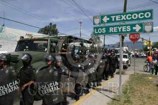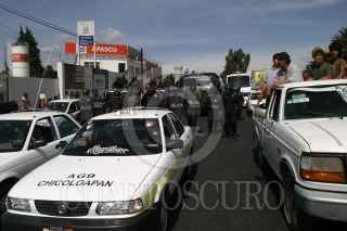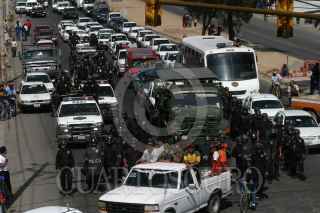 CHICOLOAPAN. EDOMEX,12OCTUBRE2007.-Un camión del Ejército mexicano se impactó contra un taxi a la altura del kilómetro 30 de la carretera federal México-Texcoco, dejando un saldo de tres personas muertas y tres lesionados. En la imagen granaderos del Estado de Mexico escoltan al camion del ejercito debido a que taxistas y pobladores pretendian retener a los uniformados. FOTO: SAUL LOPEZ/CUARTOSCURO.COM