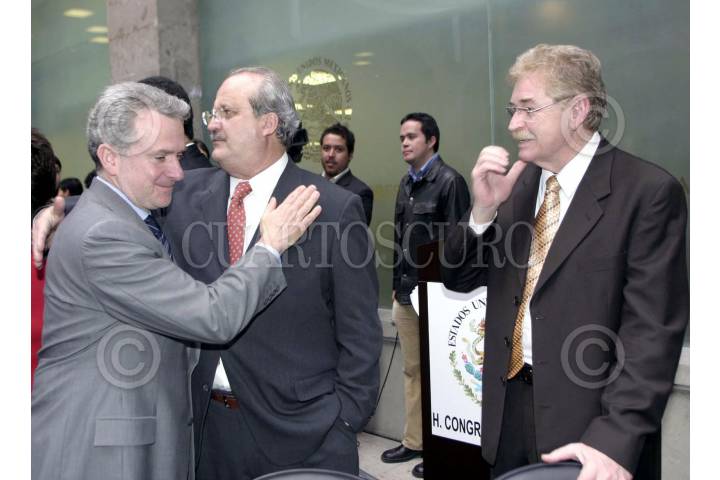 MÉXICO,D,F.,12OCTUBRE2007.- El presidente de la mesa directiva de la camara de senadores Santiago Creel Miranda saluda al senador Graco Ramirez y Javier Gonzalez Garza durante la séptima reunión de la comisión ejecutiva y construcción de acuerdos del congreso de la Unión. FOTO:CUARTOSCURO.COM
