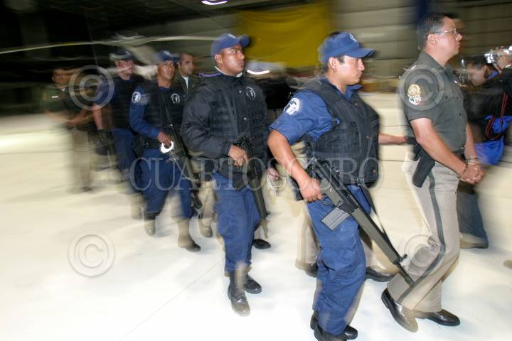 MÉXICO, D.F., 13OCTUBRE.- La PFP detiene a 25 elementos de la Policía Federal adscritos a estado de Tamaulipas por presuntos nexos con el cartel del Golfo, fueron presentados esta noche en el hangar de Federal Preventiva. FOTO: MOISÉS PABLO/CUARTOSCURO.COM