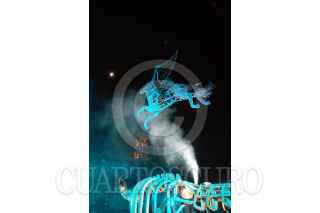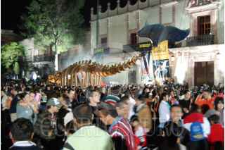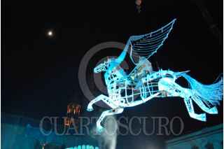 ZACATECAS, ZACATECAS, 20OCTUBRE2007.- La compañía Generis Vapuer presentó La Conferncia de los Caballos. Tirada por dos percherones, una ballena recorre el centro historico de la ciudad para encallar luego en la plaza de armas. Al final surge de su esqueleto un caballo alado que se pierde en la inmensidad de la noche. FOTO: CARLOS SEGURA/CUARTOSCURO.COM