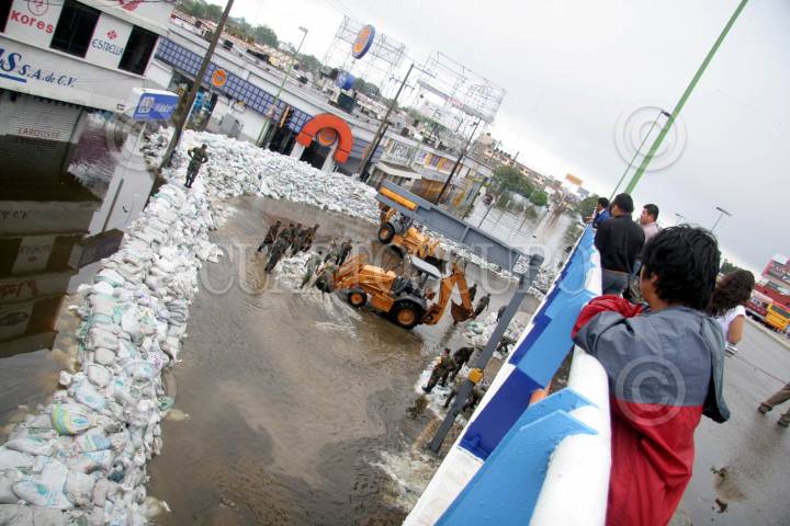 VILLAHERMOSA, TABASCO, 01NOVIEMBRE2007.- Elementos del Ejercito Mexicano trabajan arduamente al poner costales con arena para impedir que las aguas desbordadas del río Grijalva continué su paso. Las imágenes corresponden al boulevard Adolfo Ruiz Cortinez y Avenida Francisco Javier Mina. FOTO: MARCO POLO GUZMÁN HERNÁNDEZ/CUARTOSCURO.COM