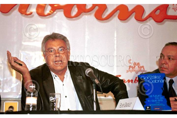 El expresidente español Felipe González, durante la presentación del libro "El futuro no es lo que era", producto de la conversación con el periodista Juan Luis Cebrián sobre el futuro de la transición española. Dicha presentación fué transmitida a 25 universidades y 17 ciudades de la República Mexicana. FOTO: Juan Pablo Zamora/CUARTOSCURO.COM