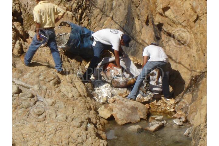 ACAPULCO, GUERRERO, 15NOVIEMBRE2007.- El cuerpo de un desconocido fue localizado dentro de un tambo de fierro azul lleno de cemento, las manos atadas hacia atrás y la cara tapada con cinta industrial gris y ambos pies tenia colocados unos grillete, el hallazgo cadavérico ocurrió en los acantilados de playa Olvidada, informó el coordinador operativo de la Policía Ministerial, Jaime Ramírez Manzanarez. FOTO: MARINO D. VALDEZ/CUARTOSCURO.COM