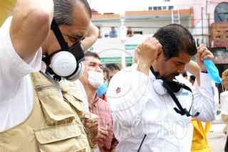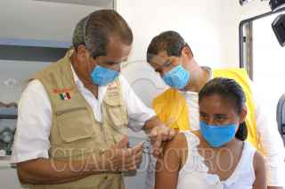 VILLAHERMOSA, TABASCO 16NOVIEMBRE2007.-El Secretarío de Salud José Angel Cordova en compañia de seceratarío de salud estatal de Luis Felipe Graham continuan con la repartición de plata coloidal, cubrebocas y vacunas, entre la población de la colonia Centro. FOTO: KARLA BERENICE PEREZ/CUARTOSCURO.COM