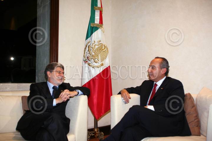 MEXICO D.F. 28 DE NOVIEMBRE DEL 2007.- El presidente Felipe Calderón Hinojosa recibió en la residencia oficial de los pinos al ministro de relaciones de extreriores de Brasil Celso Amorin. FOTO: ALFREDO GUERRERO/CUARTOSCURO.COM