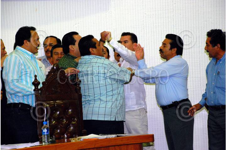 VILLAHERMOSA, TABASCO, 29NOVIEMBRE2007.- Al estilo salvajismo como luchadores de la tripla A, Diputados del Partido Revolucionario Institucional, agredieron a sus similares del PRD al inicio de la sesión en donde serían calificadas las cuentas públicas de 8 municipios. Encabezados por su coordinador José Escayola, los tricolores lanzaron puñetazos sobre la humanidad se sus opositores, siendo el iniciador del disturbio el priista David Alonso Aguirre. FOTO: MARCO POLO GUZMÁN HERNÁNDEZ/CUARTOSCURO.COM