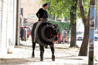MÉXICO D.F. 14DICIEMBRE2007.-Un campasino del Ajusco montado en su toro "El Consentido" de 950 kgms. acudio a las instalaciones de Televisa para participar en un concurso de mascotas ya que su animal puede incarse y sentarse como perro entre otras cosas. FOTO: PEDRO MARRUFO/CUARTOSCURO.COM