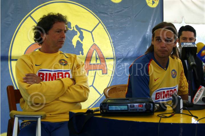 MÉXICO, D.F. 23DICIEMBRE2007.- El jugador Richard Nuñez fué presentado como el nuevo miembro de las Águilias del América. En la imagen con Daniel Alberto Brailovsky, director técnico de ese equipo, durante la conferencia de prensa que ofrecieron. FOTO: PAOLA HIDALGO/CUARTOSCURO.COM