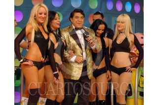 MÉXICO D.F., 05ENERO2008.- Huicho Dominguez es acompañado de bellas edecanes durante la emisión del programa Muévete que cumplio dos años al aire. FOTO: RODOLFO ANGULO/CUARTOSCURO.COM