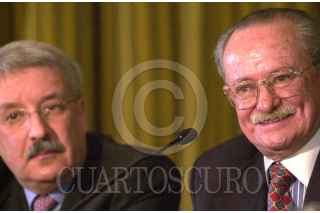 Oscar levin Coppel y Salvador Rocha Díaz, en la conferencia en la que dieron a conocer las nuevas cifras de la elección para presidente del CEN del PRI. FOTO: Victoria Valtierra/CUARTOSCURO.COM