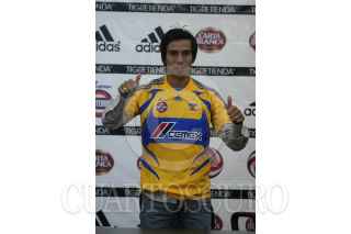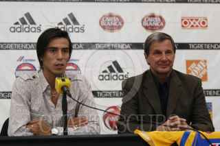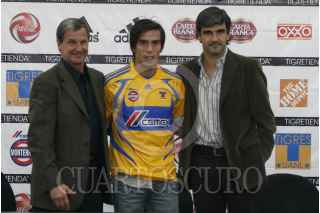 SAN NICOLAS DE LOS GARZA, NUEVO LEON 07ENERO2007.- Se presentó de manera oficial el nuevo refuerzo del club Tigres de la UANL para el torneo de clausura 2008, el volante argentino Lucas Lobos, procedente del Cádiz de España de la segunda división. En rueda de prensa estuvo acompañado del presidente del equipo Enrique Borja y el director deportivo Sebastian Luri. FOTO: PEDRO KRISTIAN LOPEZ/CUARTOSCURO.COM