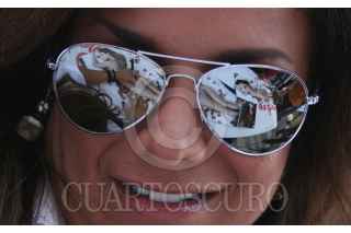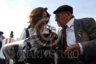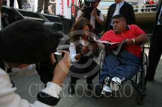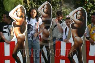 MÉXICO,D.F 11 ENERO2008.- Un fan se retira acompañado por lis vega, en tamaño natural en carton al término de la firma de autógrafos organizada por una revista para caballeros en donde este mes la cubana fue la imágen. FOTO: SASHENKA GUTIERREZ/CUARTOSCURO.COM