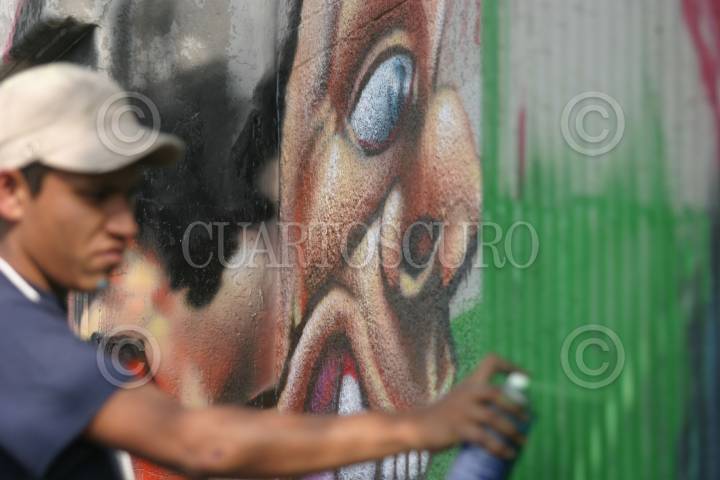 MÉXICO, D.F., 12ENERO2008.- Jovenes grafiteros realizan varias pintas en las bardas del Estadio Azteca, dentro del concurso convocado por una marca de pintura, mañana es la final por lo que los chavos se apresuran a terminar sus diseños. FOTO: MOISÉS PABLO/CUARTOSCURO.COM