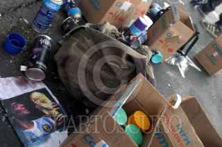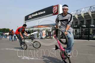 MÉXICO, D.F., 13ENERO2008.- Joóvenes realizan acrobacias con sus bicicletas en el marco del concurso de graffiti organizado por una marca de pintura y realizado en el Estadio Azteca. FOTO: ISAAC ESQUIVEL/CUARTOSCURO.COM