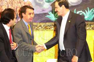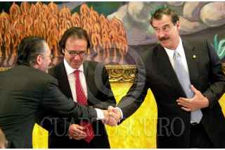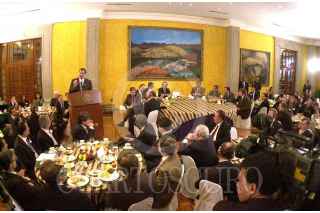 Ricardo Salinas Pliego saluda a Vicente Fox durante el desayuno con motivo de la Northamerican Broadcaster Association (NABA) Annual General Meeting, en el salón Manuel Avila Camacho de la residencia oficial de los Pinos. FOTO: Victoria Valtierra/CUARTOSCURO.COM