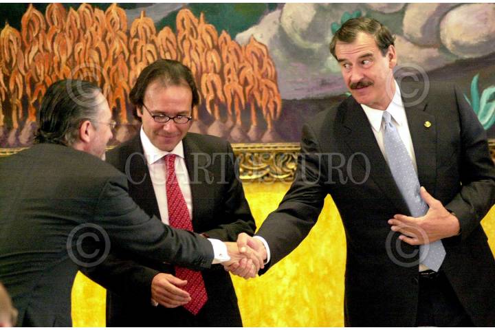 Ricardo Salinas Pliego saluda a Vicente Fox durante el desayuno con motivo de la Northamerican Broadcaster Association (NABA) Annual General Meeting, en el salón Manuel Avila Camacho de la residencia oficial de los Pinos. FOTO: Victoria Valtierra/CUARTOSCURO.COM