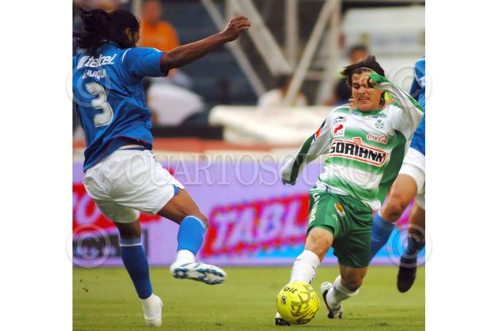 MÉXICO D.F., 19ENERO2008.- Fernando Ortiz festeja el gol anotado con Vicente José Matías de los laguneros del Santos durante el encuentro contra el Cruz Azul en la primera jornada del torneo de clausura 2008, quedando el marcador con un empate a 1 tanto. FOTO: RODOLFO ANGULO/CUARTOSCURO.COM