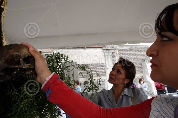 MÉXICO,D.F 20 ENERO2008.- En el kilometro 25 de la Lopez Portillo en la colonia Santa María Cuautepec en Tultitlan Estado de México existe una imágen de la Santa Muerte mas grande de Latinoamerica y la que mide poco mas de 22 metros, al medio día de este domingo se realizo una ceremonia de culto a la cuál asistieron decenas de adeptos. En la Imágen el Padrino Endoque Comandante Pantera quién llevo acabo la ceremonnia. FOTO: SASHENKA GUTIERREZ/CUARTOSCURO.COM