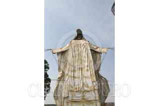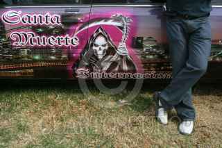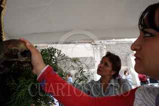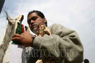 MÉXICO,D.F 20 ENERO2008.- En el kilometro 25 de la Lopez Portillo en la colonia Santa María Cuautepec en Tultitlan Estado de México existe una imágen de la Santa Muerte mas grande de Latinoamerica y la que mide poco mas de 22 metros, al medio día de este domingo se realizo una ceremonia de culto a la cuál asistieron decenas de adeptos. En la Imágen el Padrino Endoque Comandante Pantera quién llevo acabo la ceremonnia. FOTO: SASHENKA GUTIERREZ/CUARTOSCURO.COM