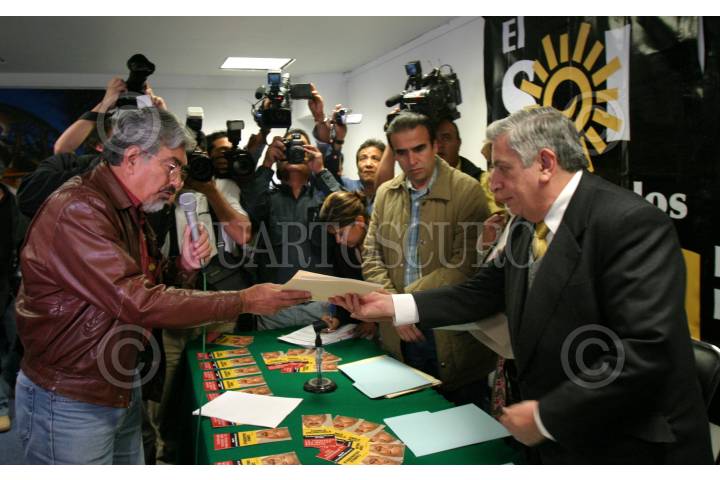 MÉXICO, D.F., 22ENERO2008.- Camilo Valenzuela, registró su candidatura a la dirigencia nacional del PRD, le recibió la documentación el senador Arturo Nuñez, el evento tuvó lugar en el centro de convenciones Expo Reforma. FOTO: MOISÉS PABLO/CUARTOSCURO.CO