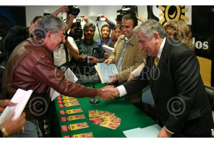 MÉXICO, D.F., 22ENERO2008.- Camilo Valenzuela, registró su candidatura a la dirigencia nacional del PRD, le recibió la documentación el senador Arturo Nuñez, el evento tuvó lugar en el centro de convenciones Expo Reforma. FOTO: MOISÉS PABLO/CUARTOSCURO.CO