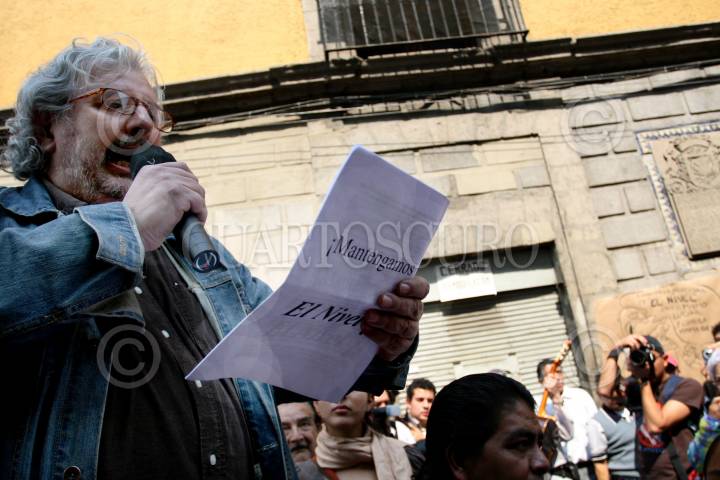 MÉXICO D.F. 29ENERO2008.-Retauranteros y parroquianos de la Cantina el Nivel, protestan a las afueras de esta, por su cierre indefinido y en espera de que se llegue a una negociación a con las autorides correspondientes para poder reabrir, después de la perdida del litigio en el que se encontraba antes de fallecer su anterior dueño.En la imagen Aurelio Sandoval y Rogelio Frausto Rodríguez, cantineros de este lugar. FOTO: GUILLERMO PEREA/CUARTOSCURO.COM