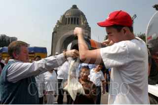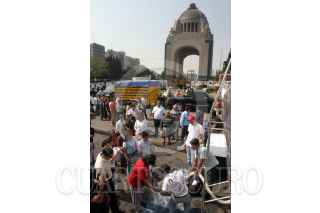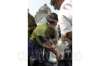 MÉXICO, D.F., 29ENERO2009.- Los productores de leche que se manifiestan en el Monumento a la Revolución, regalaron su producto a la gente como una forma de protesta por que según ellos no pueden comerciazarla, personas se tuvieron que formar por tres horas para recibir el lacteo. FOTO: PEDRO MARRUFO/CUARTOSCURO.COM