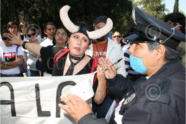 MÉXICO D.F., 02FEBRERO2008.- Miembros y simpatizantes de las Asociaciones Protectoras de Animales de Mexico se manifestaron en contra de las corridas de toros que se realizan en La Plaza de Toros Mexico, los manifestantes formaron una valla sobre Avenida Insurgentes en el tramo del Parque Hundido hasta la estacion del metrobús Ciudad Deportiva. FOTO:RICARDO CASTELAN/CUARTOSCURO.COM
