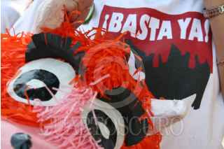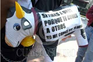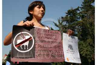 MÉXICO D.F., 02FEBRERO2008.- Miembros y simpatizantes de las Asociaciones Protectoras de Animales de Mexico se manifestaron en contra de las corridas de toros que se realizan en La Plaza de Toros Mexico, los manifestantes formaron una valla sobre Avenida Insurgentes en el tramo del Parque Hundido hasta la estacion del metrobús Ciudad Deportiva. FOTO:RICARDO CASTELAN/CUARTOSCURO.COM