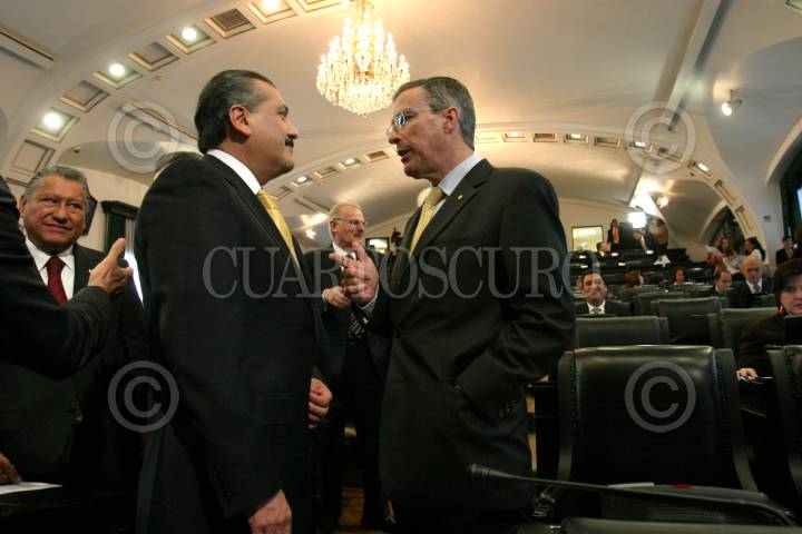 MÉXICO, D.F., 05ENERO2008.- Los senadores Pablo Gómez, PRD y Manlio Fabio Beltrones, PRI, durante la sesión ordinaria en el Senado de la República. FOTO: MOISÉS PABLO/CUARTOSCURO.COM