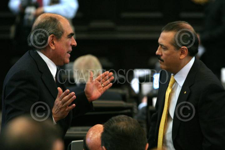 MÉXICO, D.F., 05ENERO2008.- Los senadores Pablo Gómez, PRD y Manlio Fabio Beltrones, PRI, durante la sesión ordinaria en el Senado de la República. FOTO: MOISÉS PABLO/CUARTOSCURO.COM