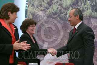 MEXICO D.F., 06FEBRERO2008.- Louise Arbour, Alta Comisionada de las Naciones Unidas de las Naciones Humanas saluda a Felipe Calderón Hinojosa, Presidente de México, durante la ceremonia del convenio de cooperación en materia de derechos humanos con nuestro país. FOTO: ALFREDO GUERRERO/CUARTOSCURO.COM