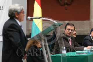 MÉXICO D.F. 11FEBRERO2008.-Marcelo Ebrad jefe de gobierno capitalino realizó la Firma de la Carta Intención para el Intercambio de Información y Colaboración en materia de Desarrollo Social con la Embajada de Bolivia.En la imege es acompañado por Jorge Mansilla Torres Embajador de Bolivia en México. FOTO: GUILLERMO PEREA/CUARTOSCURO.COM