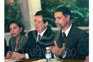 El Secretario del trabajo y Previsión Social, Carlos Abascal,junto con la Secretaría de Desarrollo Social, Josefina Vazquez Mota, y el encargado de la oficina para personas con discapacidad de la Presidencia, Victor Hugo Flores, se reunierón con empresarios para tratar el tema de como emplear a los discapacitados. FOTO: Eunice Adorno/CUARTOSCURO.COM