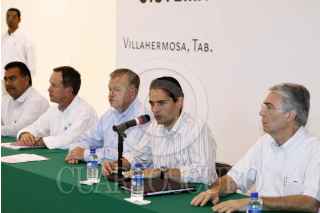 VILLAHERMOSA, TABASCO, 12FEBRERO2008.- En el marco de la Semana Nacional de Protección Civil, el gobernador tabasqueño Andres Granier Melo y el Secretario de Gobernación Juan Camilo Mouriño Terrazo ofrecieron una rueda de prensa en el hangar de gobierno. FOTO: MARCO POLO GUZMÁN HERNÁNDEZ/CUARTOSCURO.COM