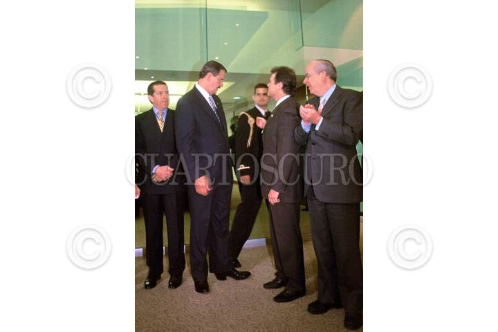 Mario Laborín conversa con el presidente Vicente Fox, mientras Eduardo Sojo, Yeickol Polevnsky y Claudio X. González hacen lo propio, en la inauguración del centro financiero de Nafin. FOTO: Victoria Valtierra/CUARTOSCURO.COM