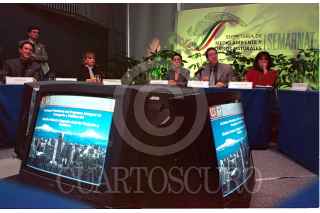 Claudia Sheinbaum, Secretaria de Medio Ambiente del D.F. y Víctor Lichtinger, Secretario de Medio Ambiente y Recursos Naturales del Gobierno Federal, se saludan antes de comenzar a platicar sobre el "Proyecto del Segundo Piso en Viaducto y Periférico". FOTO: Christian Palma/CUARTOSCURO.COM