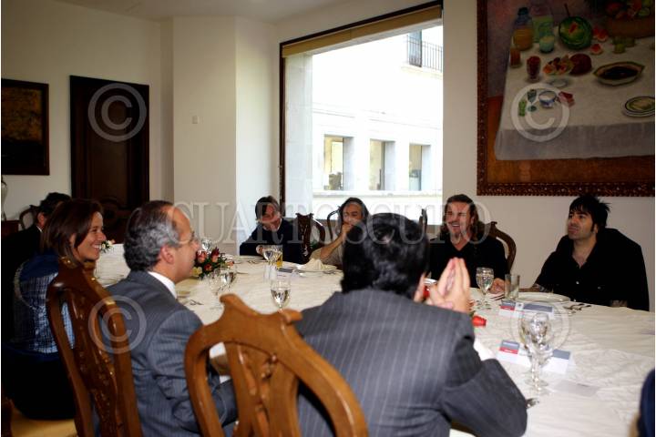 MEXICO D.F., 18FEBRERO2008.- El presidente de México, Felipe Calderón Hinojosa, recibió en la residencia oficial de los pinos a los integrantes del grupo maná y a la fundación ecológica selva negra de la cual son miembros FOTO: IMPERIO RESENDIZ/CUARTOSCURO.COM