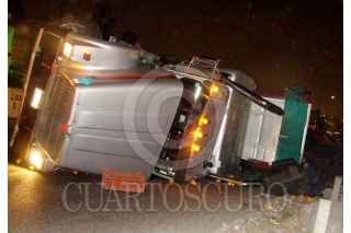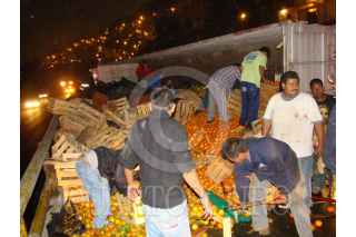 MÉXICO, D.F., 20FEBRERO2008.- En la madrugada se volcó un trailer con más de 25 toneladas de naranja y mandarina, los hechos se suscitaron en la incorporación de los carriles de la autopista México-Pachuca, en dirección hacia Insurgentes a la altura de la colonia CTM el Risco, el percance ocasiono un enorme caos vehicular. FOTO: DANIEL CRUZ CHAPARRO/CUARTOSCURO.COM
