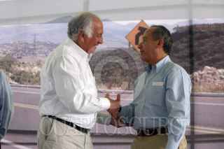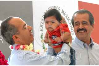 AQUISMON, SAN LUIS POTOSÍ, 26FEBRERO2008.- Felipe Calderón Hinojosa, Presidente de México, acompañado de José Angel Cordoba Villalobos, Secretarío de Salud Federal, comtemplan a un niño afiliado por el Seguro Médico para una Nueva Generación, durante la ceremonia de arranque de dicho programa. FOTO: EDUARDO MORALES/CUARTOSCURO.COM