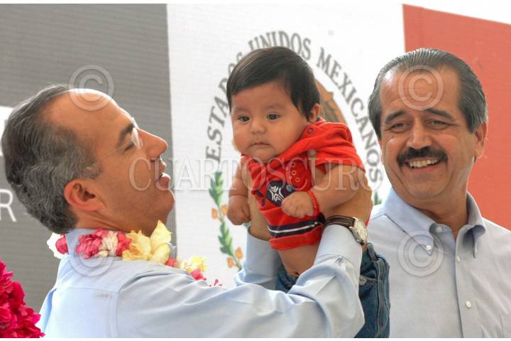 AQUISMON, SAN LUIS POTOSÍ, 26FEBRERO2008.- Felipe Calderón Hinojosa, Presidente de México, acompañado de José Angel Cordoba Villalobos, Secretarío de Salud Federal, comtemplan a un niño afiliado por el Seguro Médico para una Nueva Generación, durante la ceremonia de arranque de dicho programa. FOTO: EDUARDO MORALES/CUARTOSCURO.COM