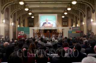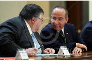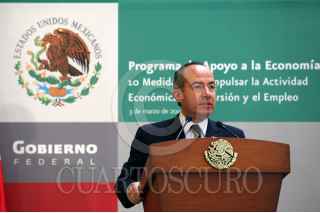 MEXICO, D.F., 03MARZO2008.- El presidente de México, Felipe Calderon Hinojosa, durante el programa de apoyo a la economia, 10 medidas para impulsar la actividad productiva, inversión y el empleo, que se realizó en el salon Tesorería de Palacio Nacional. En la imagen el secretario de Hacienda, Agustin Carstens y el presidente Felipe Calderon. FOTO: ALFREDO GUERRERO/CUARTOSCURO.COM
