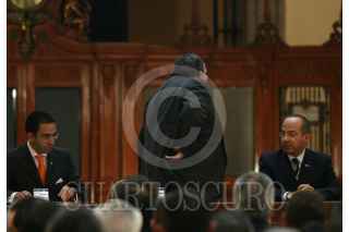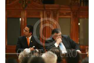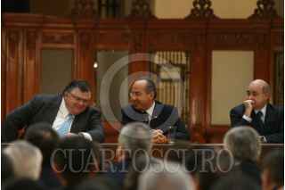 MEXICO, D.F., 03MARZO2008.- Javier Lozano Secretario del Trabajo, Agustin Carstens Secretario de Hacienda , durante el inicio del del programa de apoyo a la economia, 10 medidas para impulsar la actividad productiva, inversión y el empleo, que se realizó en el salon Tesorería de Palacio Nacional. FOTO: SASHENKA GUTIERREZ/CUARTOSCURO.COM