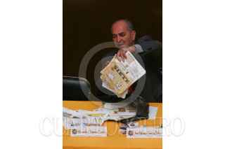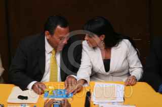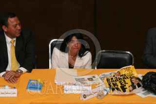 MÉXICO D.F. 07MARZO2008.-Candidatos a dirgencia del PRD en el D.F. realizarón su debate donde dieron a conocer sus motivos para que simpattizantes los apoyen en las proximas elecciones internas del partido.En la imagen los perredistas Jesús Zambrano y Elejandra Barrales durante el debate, en la mesa se muestra la propaganda de la candidata. FOTO: GUILLERMO PEREA/CUARTOSCURO.COM.