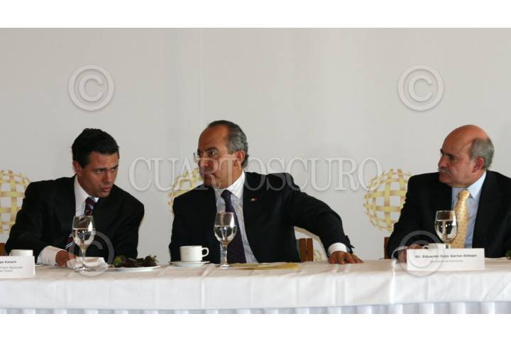 MÉXICO D.F. 10MARZO2008.-El presidente, Felipe Calderón Hinojosa, acudio a la comida de Clausura de los trabajos de la LXXI Asamblea General Ordinaria de la Cámara Nacional de la Industria Textil.En la imagen es acompañado por Enrique Peña Nieto, Gobernador del Estado de México, Rafael Zaga Calach presidente saliente de la cámara, Davida García Cosio presiednte entrante de la cámara y Eduardo Sojo, titular de la Secretaría de Economia. FOTO: GUILLERMO PEREA/CUARTOSCURO.COM