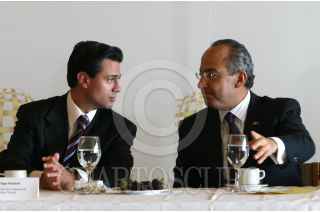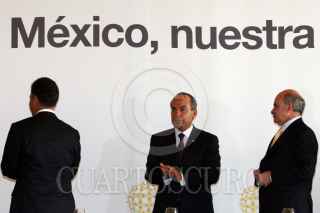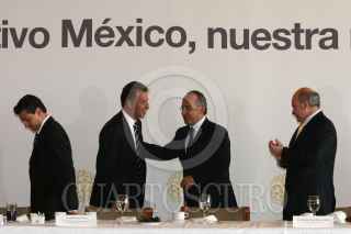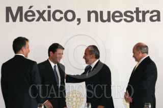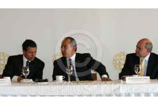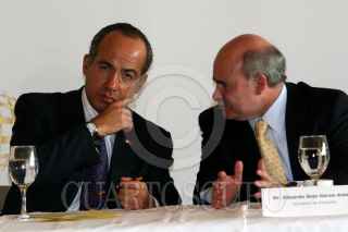 MÉXICO D.F. 10MARZO2008.-El presidente, Felipe Calderón Hinojosa, acudio a la comida de Clausura de los trabajos de la LXXI Asamblea General Ordinaria de la Cámara Nacional de la Industria Textil.En la imagen es acompañado por Enrique Peña Nieto, Gobernador del Estado de México, Rafael Zaga Calach presidente saliente de la cámara, Davida García Cosio presiednte entrante de la cámara y Eduardo Sojo, titular de la Secretaría de Economia. FOTO: GUILLERMO PEREA/CUARTOSCURO.COM