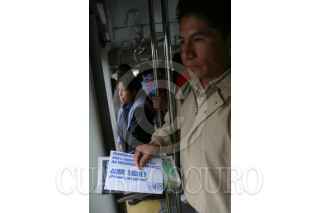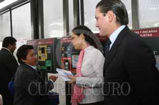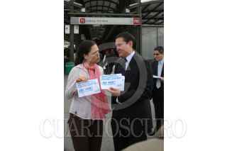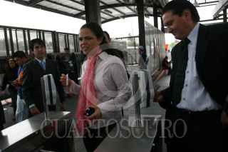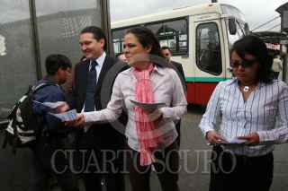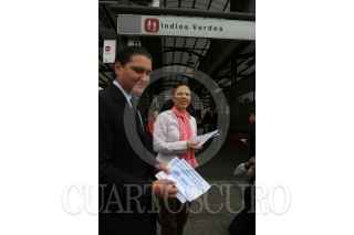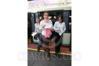 MÉXICO D.F. 24MARZO2008.-Mariana Gómez del Campo, dirigente del PAN en el D.F. acompañada de Jacobo Manfredo Bonilla, asambleista del mismo partido, volantearon en contra del aumento de la tariafa del Metrobus en la estación de Indios Verdes. FOTO: GUILLERMO PEREA/CUARTOSCURO.COM