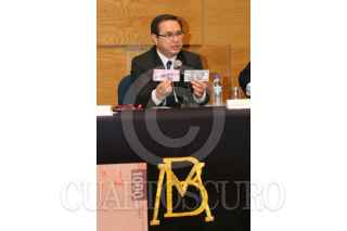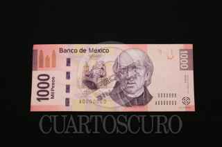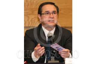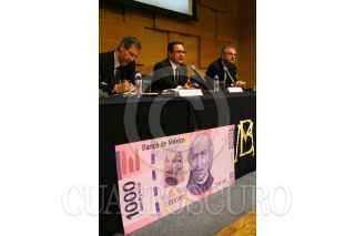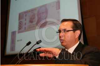 MEXICO, D.F. 31MARZO2008.- Manuel Galán Medina, Director General de Emisión del Banco de México, realizo la presentación del nuevo billete de 1000 pesos, predominante de color rosa y que el anverso tiene la efigie de don Miguel Hidalgo y Costilla y en reverso se aprecia un grabado de la Universidad de Guanajuato, dicho billete comenzara a circular apartir de este 7 de Abril. FOTO: GUILLERMO PEREA /CUARTOSCURO.COM
