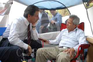 MÉXICO D.F. 01ABRIL2008.-Jesús Ortega Martínez, candidato a la presidencia nacional del PRD, visitó al perredista José Alcaraz, que realiza una huelga de hambre en favor de la unidad del partido esto frente a la sede nacional del PRD. FOTO: CUARTOSCURO.COM