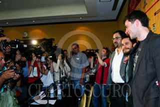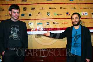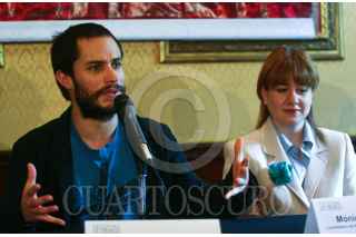 MÉXICO, D.F., 09ABRIL2008.- El director Gisli Örn y el actor Gael García durante la conferencia de prensa para anunciar la presencia de la obra teatral "La Comuna" dentro de las actividades del Festival de México en el Centro Histórico. FOTO: ISAAC ESQUIVEL/CUARTOSCURO.COM